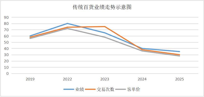 從2019年到2025年,去掉中間兩年因?yàn)橐咔槌霈F(xiàn)的異常數(shù)據(jù),春節(jié)期間傳統(tǒng)百貨店的銷售業(yè)績在2022年達(dá)到相對高值,高于2019年,之后呈現(xiàn)連續(xù)下降特點(diǎn)。而2022年的高值,可以視為疫情特殊時期的消費(fèi)表現(xiàn)。